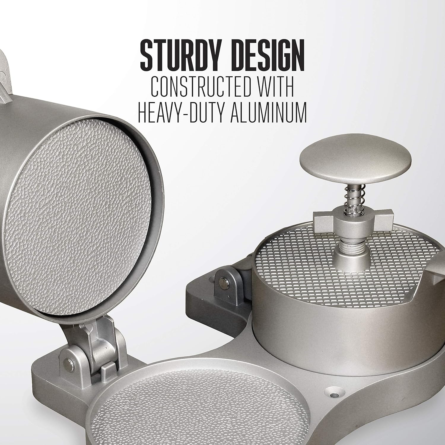 - Grosor ajustable de la hamburguesa de 1/4 pulgadas a 1 ½ in con un diámetro de 4 ½ pulgadas.